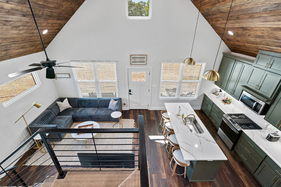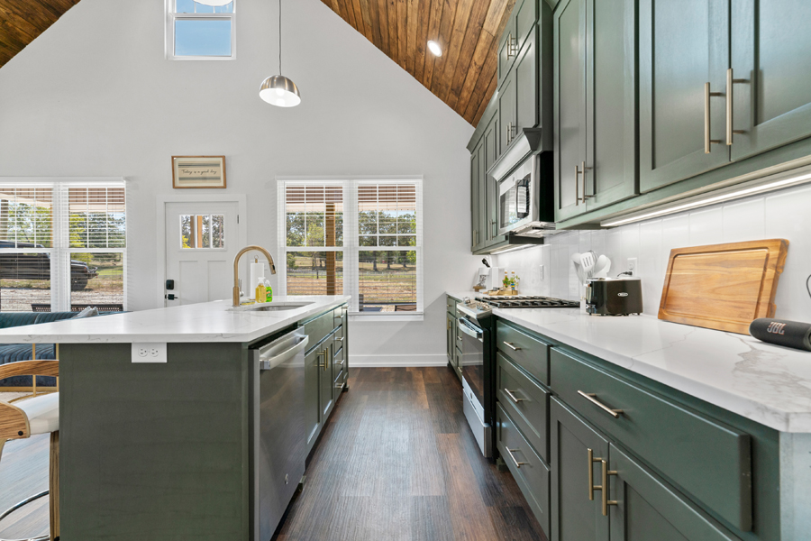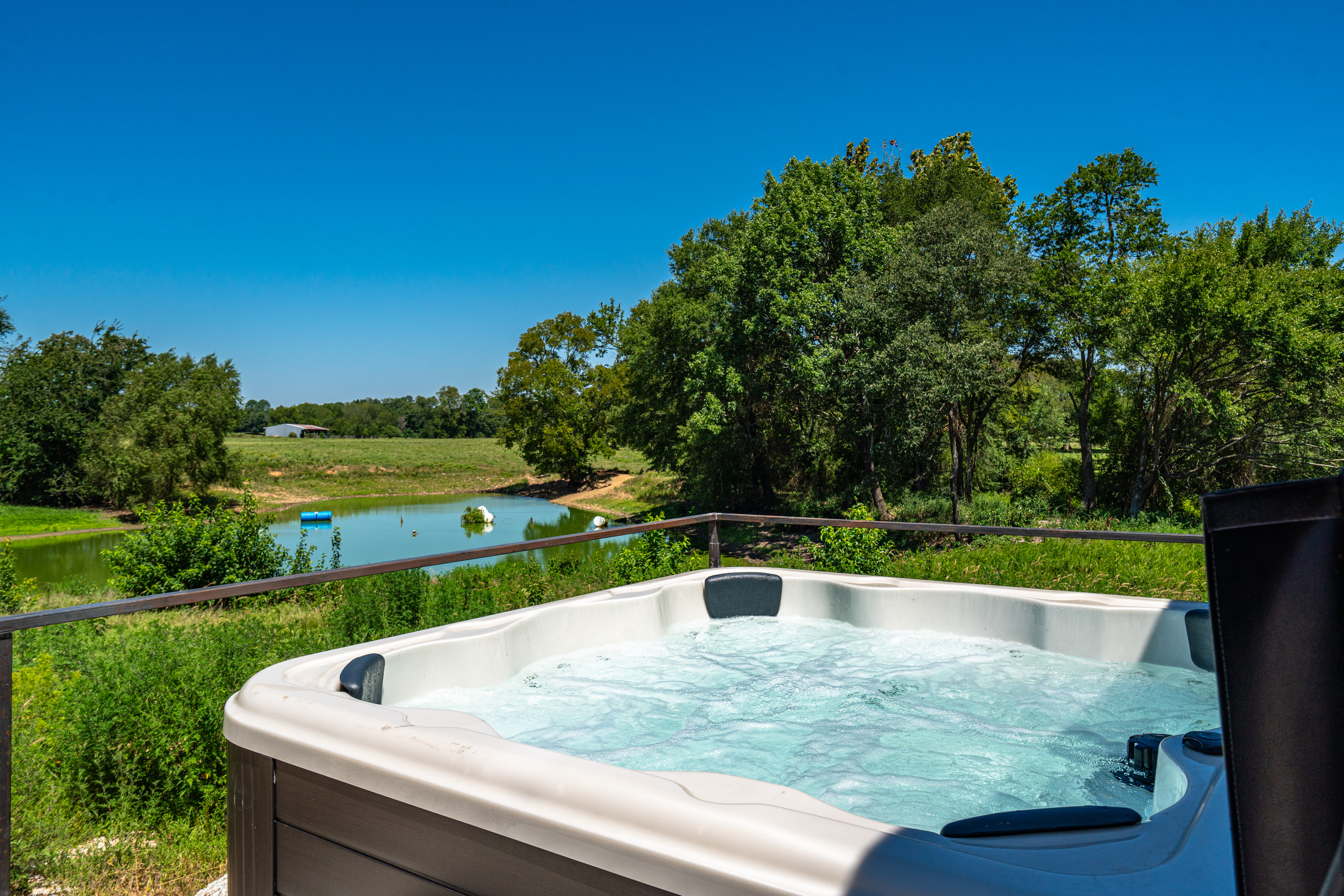Each cabin includes two king bedrooms with ensuite bathrooms, a loft with two twin beds, smart TVs, high-speed Wi-Fi, a fully stocked kitchen, washer and dryer, and a cozy gas fireplace (seasonal). Outside, you’ll find a private 6-person hot tub, fire pit, grill, and front and back porches overlooking peaceful pasture views. Set on two quiet acres just minutes from Lake Hamilton, downtown Hot Springs, and Oaklawn, it’s a comfortable, well-equipped base for exploring the area or just relaxing. Towels, linens, toiletries, games, and keyless entry are all provided.